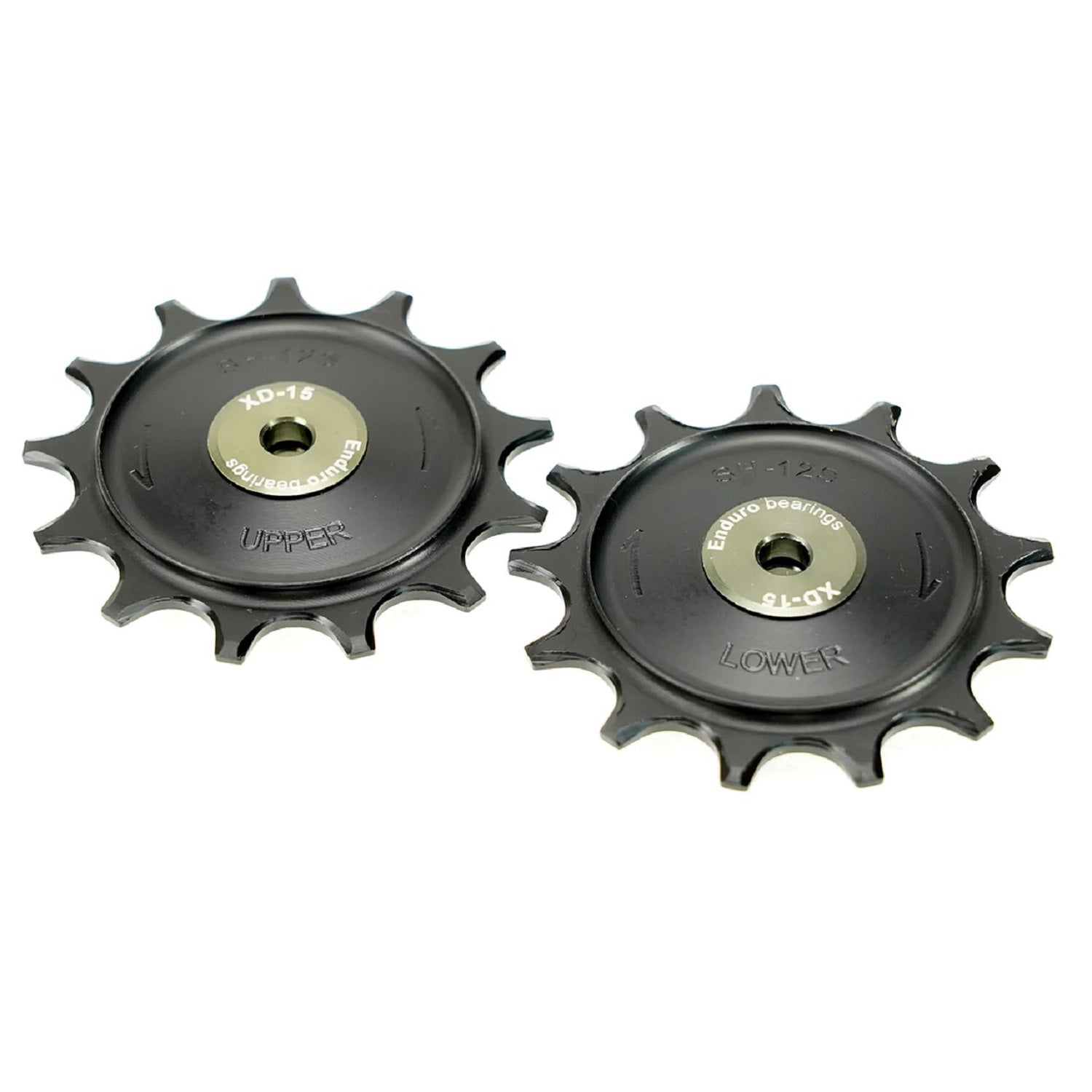 Precision machined Delrin® Derailleur pulleys featuring XD-15 Ceramic-Hybrid, radial bearings for enhanced shifting performance and longevity. Designed and manufactured for performance, these pulleys feature CN (tight clearance) bearings in the upper pulley to maximize shifting accuracy and C4 (loose clearance) bearings in the lower pulley to allow for chain-line movement.